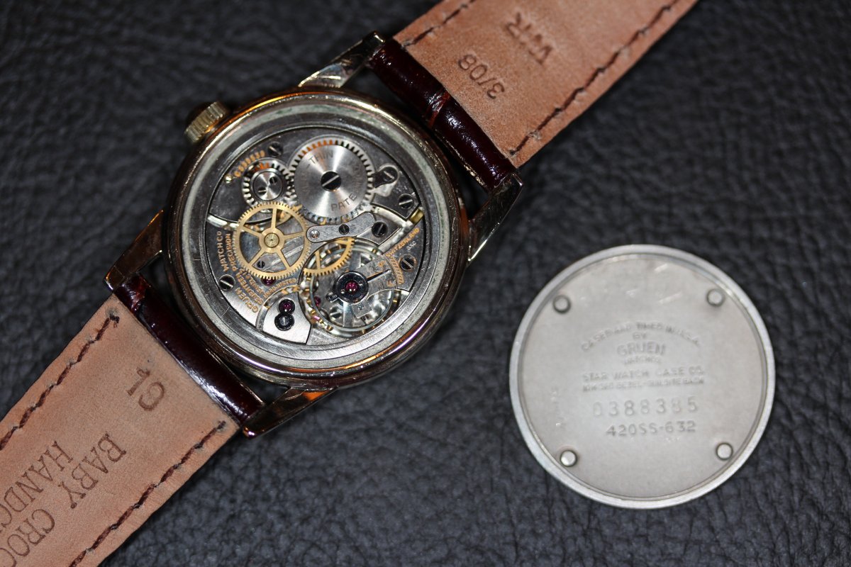 I finished one more of my projects, which started life as a NOS dial and 420SS movement that I bought of eBay two years ago. At that time the dial was id'ed by a fellow Gruenite on the old forum and he posted a picture (I forgot who, but if it is one of you guys apologies for using your picture ). This picture is what drove my 2 year quest for the right case...