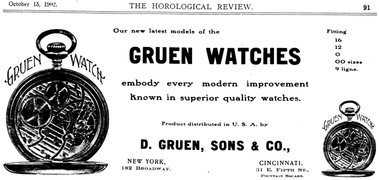 Interesting info Paul. 1902 is the earliest ad I have seen so far of their Swiss Extra Precision movements that Gruen started to market. The assumption is they started as early as 1900 with these movements, based on an article published in "The Jewelers' Circular - Weekly and Horological Review, February 28, 1900, pp. 33-4". Still don't know who actually produced these movements? Some assumed it was Aeby&Landry, but I researched that this can't have been the case.