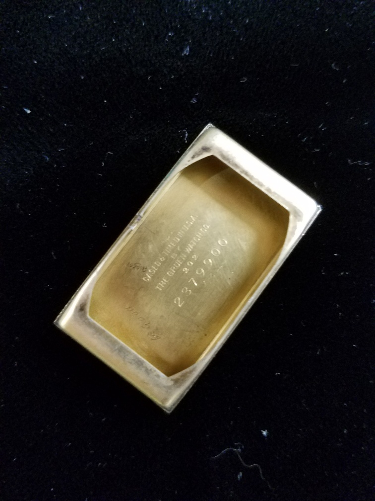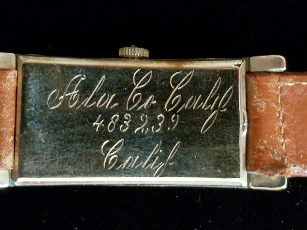 Other info : First year for the Curvex. Odd the 00 endings of the case and movement serial. 352300 almost sounds like this was a 1935 movement batch 2300. The inscription is hard to read and I cannot make out what it says. The number is a mystery too.