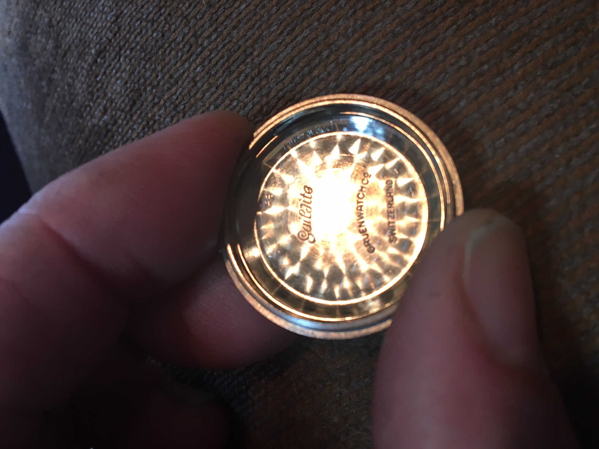Inside the watch is a circled "460SS." Also "Gruenwatch Co Precision Switzerland Seventeen 17 Jewels IG43874 Unadjusted Autowind Veri-Thin Patented"