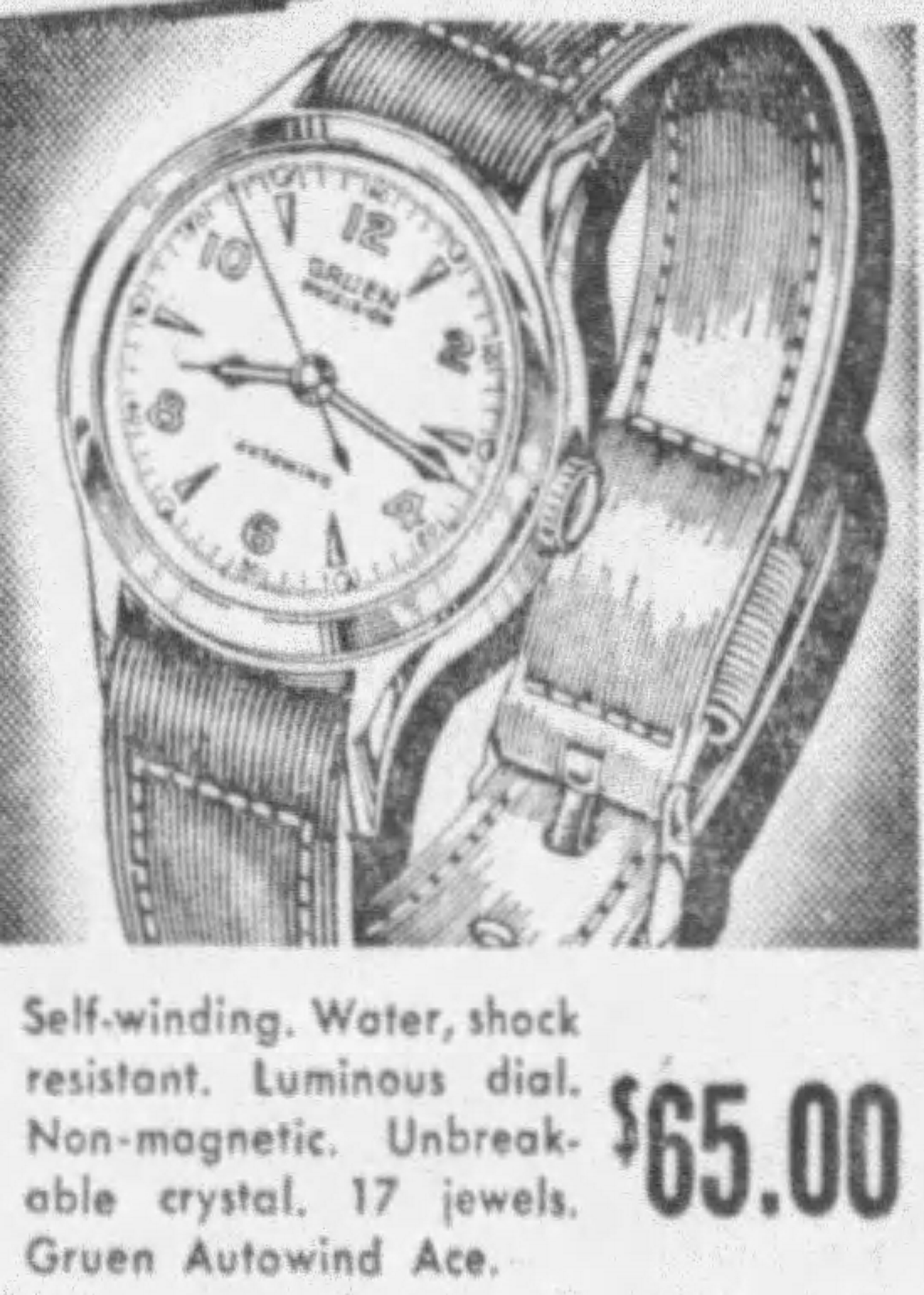 But this one I would say is one of the watches sold under the name "Autowind Ace". I have about 20 ads showing Autowind Ace versions with different dials from 1949 to 1953. This one seems to be matching: