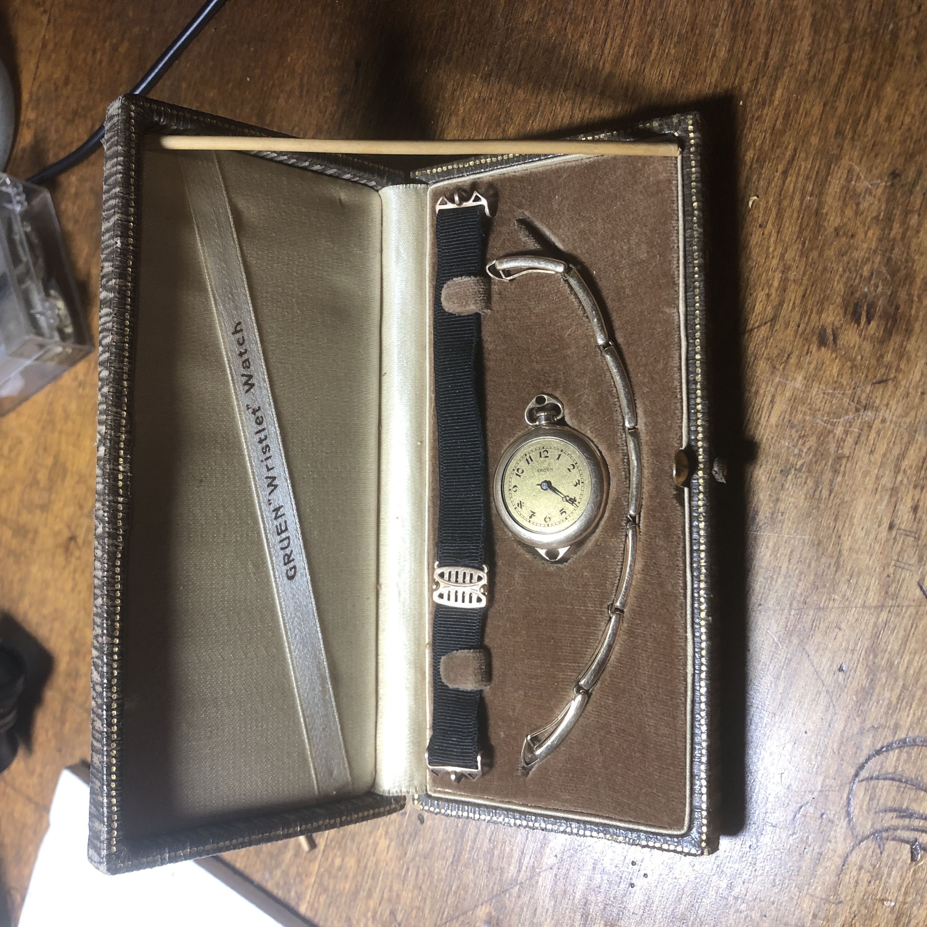 Fake leather wooden box in greyish/taupe color with a gold print. Also the text "gruen wristlet watch" on the front side. Has a metal push button to open te case. Inside the case there is a greyish velvet holder for a convertible watch, smal metal strap and ribbon strap. Has silk in the lid stamped "gruen wristlet watch".
