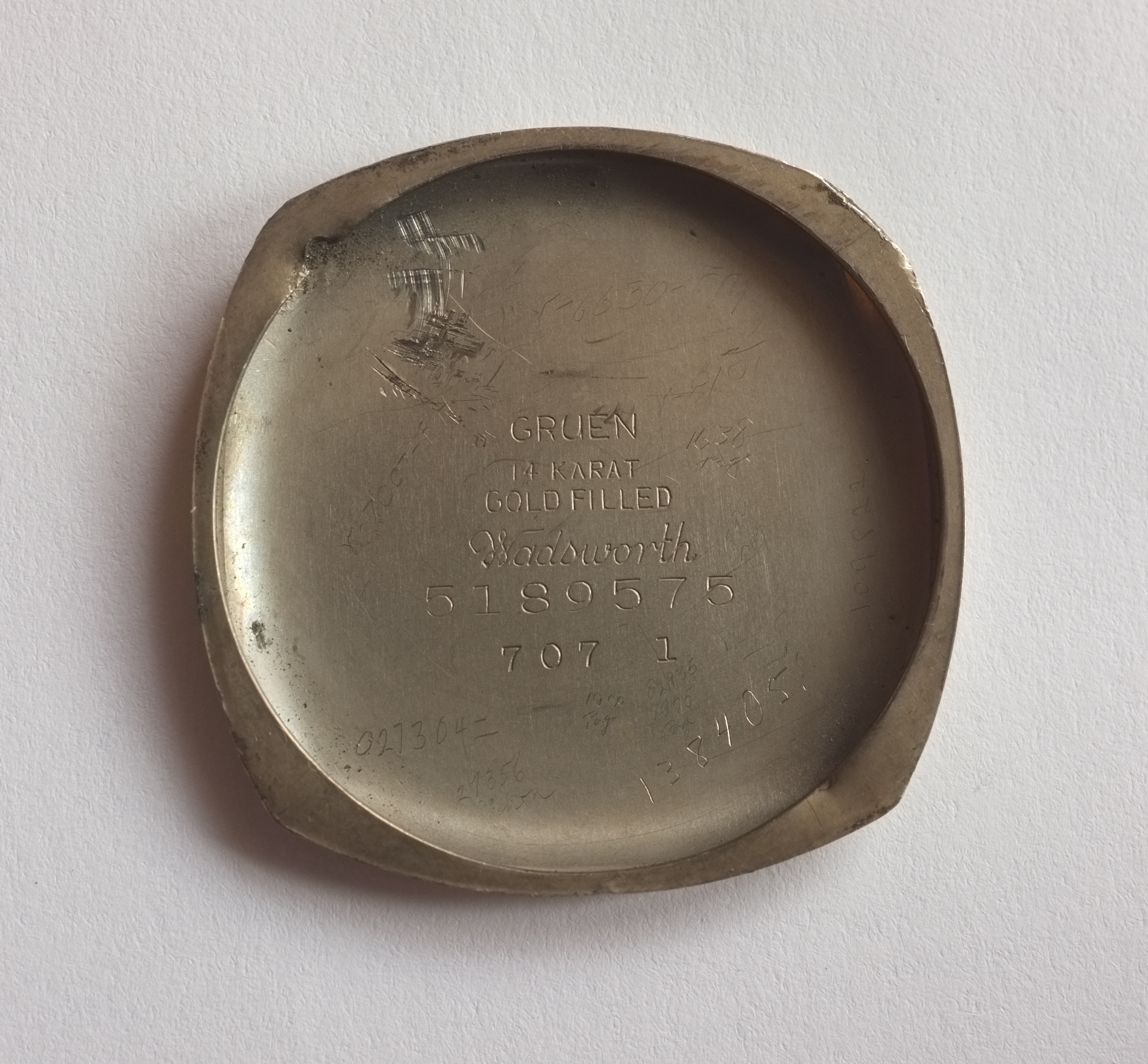 -1924-01-01: All cases made and stamped for Wadsworth have a purity mark (see "14k Gold reinforced with metal", "14k Gold filled"). Gruen used a technicality to continue to have Wadsworth make a special Ultra Quality line of cases without a purity stamp, but Wadsworth took their name off of it--those are the special Gruen cursive font Ultra Quality cases. Like John Hancock's signature on the Declaration of Independence, if the FTC came after Gruen, they made it clear they stood behind the product.