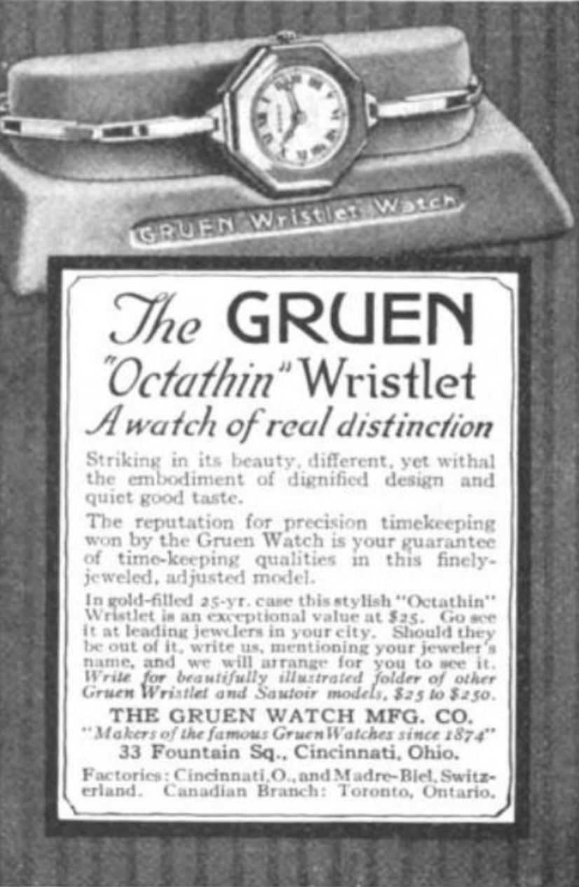 Ok, thanks! Yup, there are these images of Gruen Wrislet Watch inserts from 1916. But I have yet to see a box in an advertisement that matches my box exactly. My insert is not removable. Good to know I'm in the ballpark. The 1912 boxes have similarities to mine but the inserts are quite different. So what was the colour of velvet in the wristlet boxes before brown?
