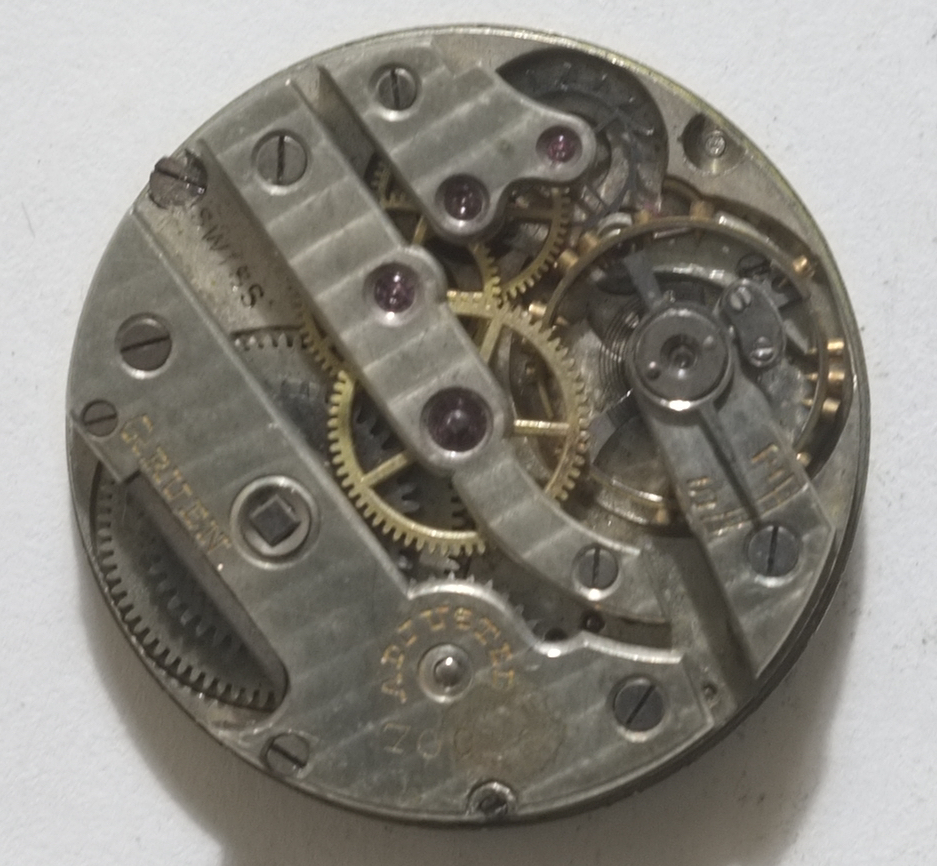 Of note, the jewel count is ... [drumroll please] ... 15! Yes, 15. The center wheel and third wheel are both only jeweled on the top. I've never seen this jeweling configuration on a Gruen before.