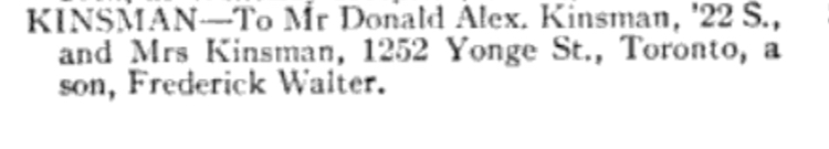 Mr Donald Alexander Kinsman, University of Toronto class of 1922. So about 32-33 years old in 1933, with an 8 year old son.