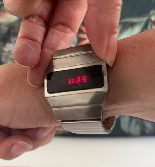 Other info: A LED watch is an electronic quartz watch with a digital display. Generally has 4 digits with 7 segments each. It is controlled by a tiny digital circuit with one ore more microchips. A 70s LED watch always needs two 1.5 V button cells, every 3 months. 😅 It has several leds in one segment. It is hard to get a good picture of the time…  when pushing the button it only appears briefly.
