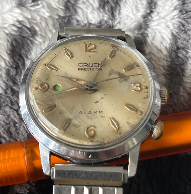 Dial has RA Swiss on it. Yup, still radioactive. When the alarm is on the dot is green, normal mode the dot is red. Unusual is only one barrel. Movement patent is 2803940 ( https://docs.google.com/viewer?url=patentimages.storage.goog leapis.com/pdfs/US2803940.pdf)